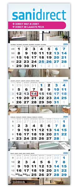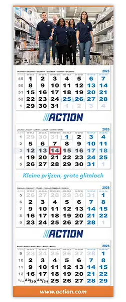 Uiteraard is er op onze kalenders veel ruimte voor je logo, bedrijfsbeeld of motto. Zowel prominent aan de bovenzijde van de kalenders als onderaan. Deze kalender is letterlijk het allergrootste relatiegeschenk en kan als busstuk worden verzonden. Voor een kleiner overzicht is de 3-maandkalender, ook wel gezien als kwartaalkalender, een mooi alternatief. Liever een kalender met een enkele maandweergave? Bekijk dan eens onze selectie van maandkalenders.