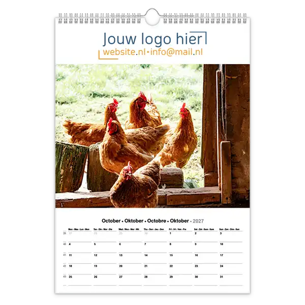 Ontdek onze betoverende 13-bladige kalender met schattige foto’s van boerderijdieren! Ideaal voor bedrijven, deze kalender kan volledig op maat worden gemaakt met uw logo en bedrijfsgegevens. Wil je een unieke kalender die echt bij jouw bedrijf past? Ontwerp dan je eigen boerderijdieren fotokalender A3 met jouw foto’s. Perfect als relatiegeschenk, voor intern gebruik of als promotiemateriaal. Jij levert de foto’s aan en daarna zorgen wij voor een professionele opmaak én een gratis proefdruk na goedkeuring van de offerte.