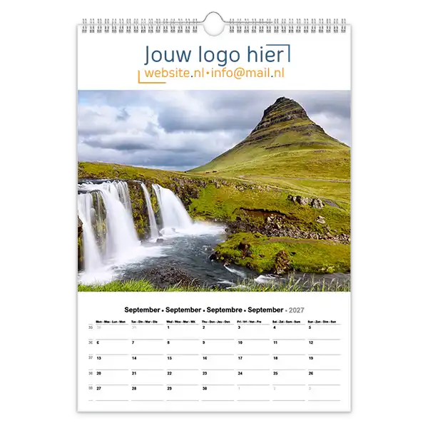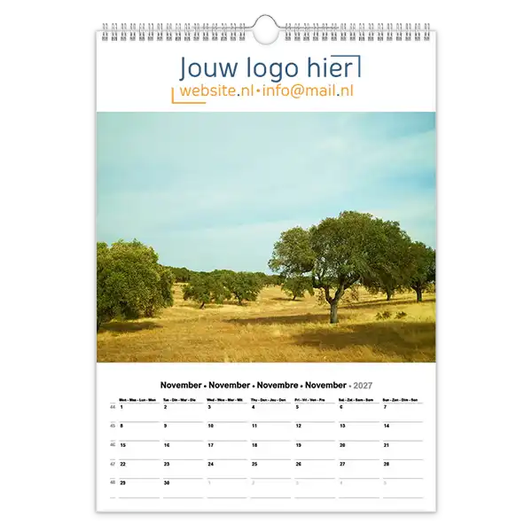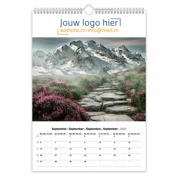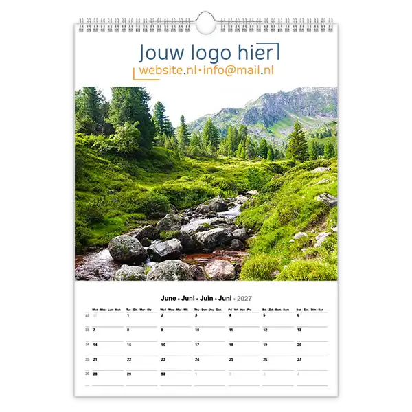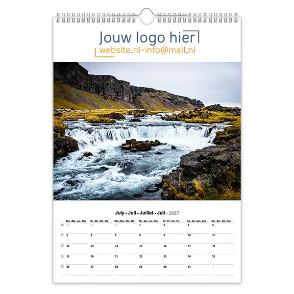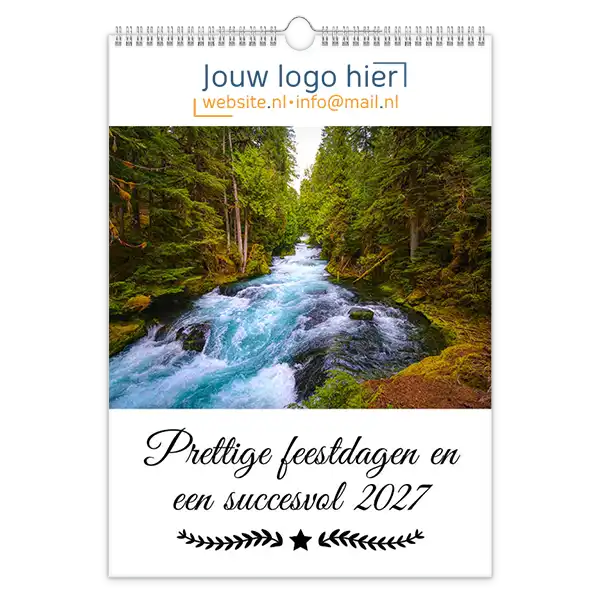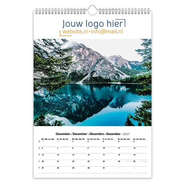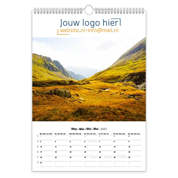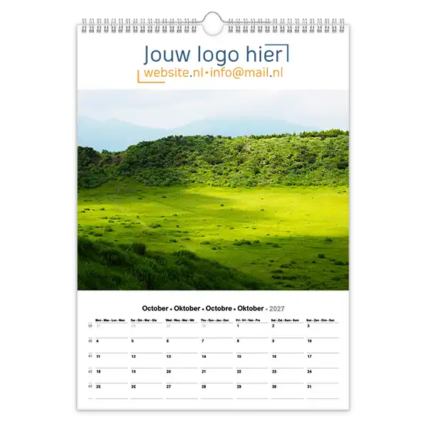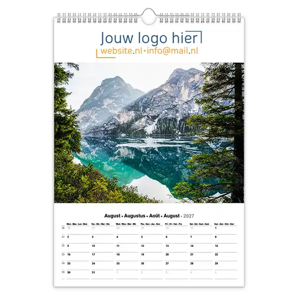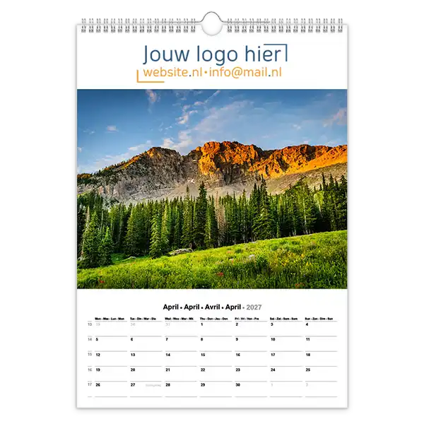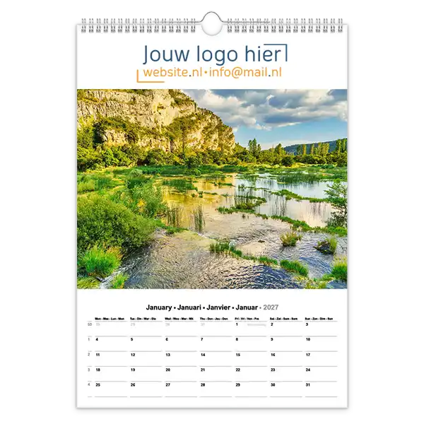 Ontdek onze betoverende 13-bladige kalender met prachtige foto’s van landschappen en natuur! Ideaal voor bedrijven, deze kalender kan volledig op maat worden gemaakt met uw logo en bedrijfsgegevens. Wil je een unieke kalender die echt bij jouw bedrijf past? Ontwerp dan je eigen landschap fotokalender A3 met jouw foto’s. Perfect als relatiegeschenk, voor intern gebruik of als promotiemateriaal. Jij levert de foto’s aan en daarna zorgen wij voor een professionele opmaak én een gratis proefdruk na goedkeuring van de offerte.