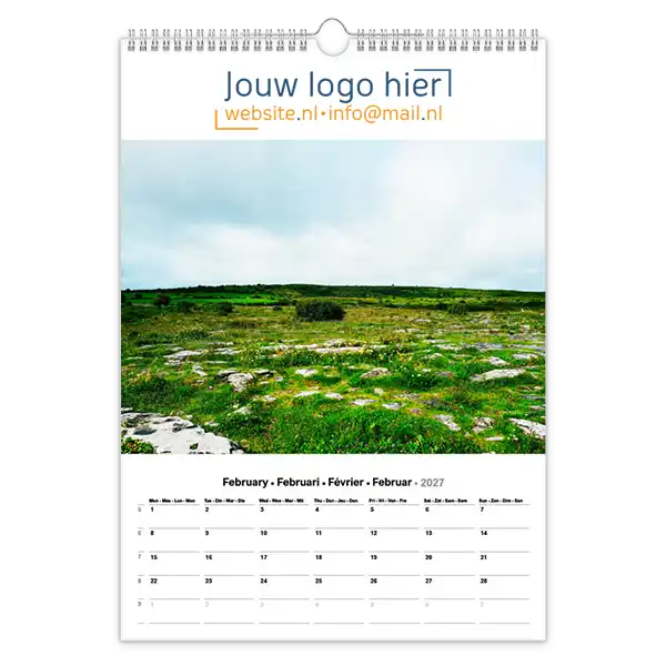 Een landschappenkalender met jouw bedrijfslogo of een persoonlijke boodschap is ideaal om het hele jaar zichtbaar te zijn bij klanten en relaties. Bij Kalendersbestellen.nl kun je je fotokalender laten bedrukken met jouw logo, slogan of een boodschap die past bij jouw merk.