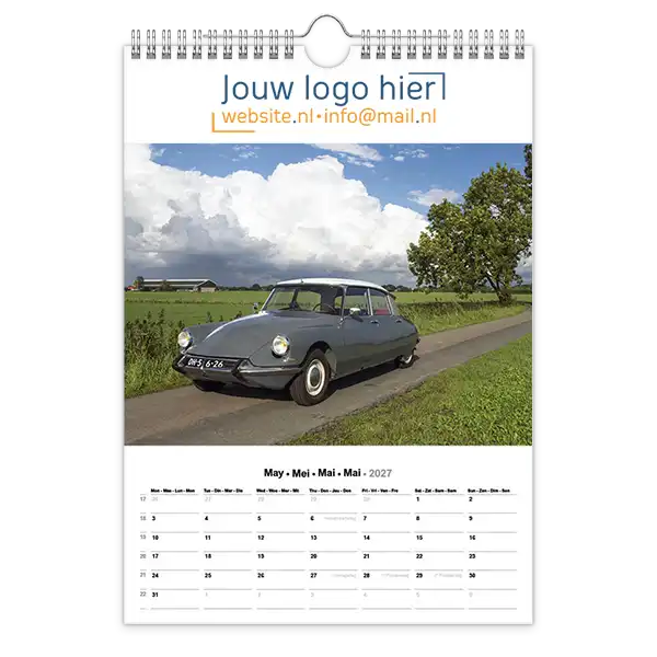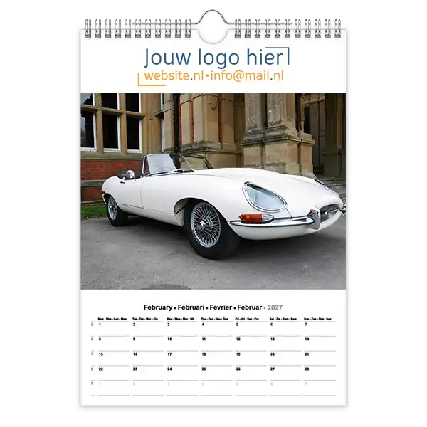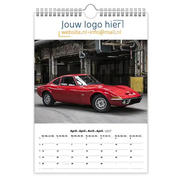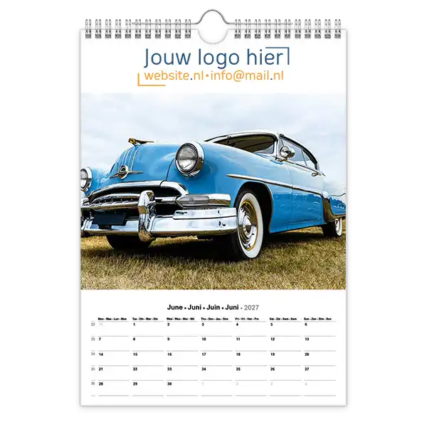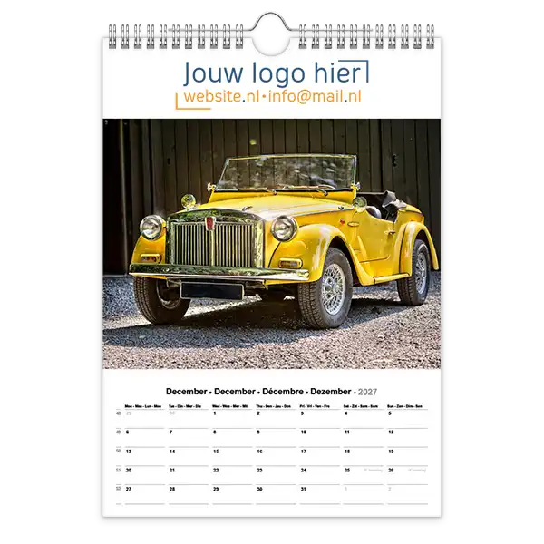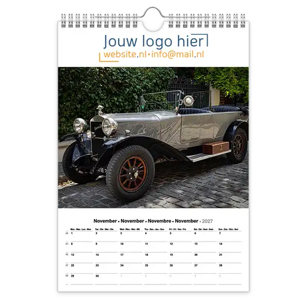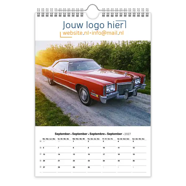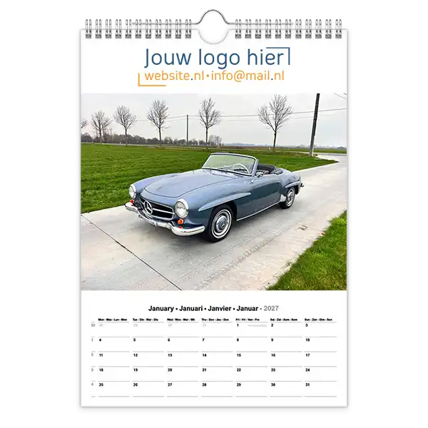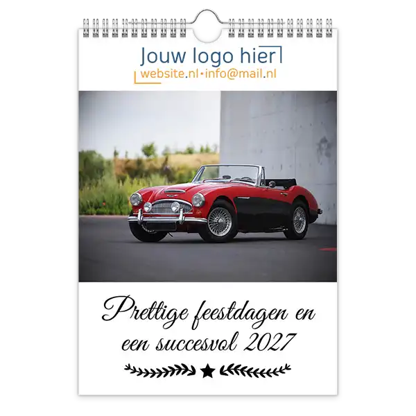 Ontdek onze prachtige 13-bladige kalender met oude foto’s van vintage auto’s! Ideaal voor bedrijven, deze kalender kan volledig op maat worden gemaakt met uw logo en bedrijfsgegevens. Wil je een unieke kalender die echt bij jouw bedrijf past? Ontwerp dan je eigen oldtimers auto fotokalender A4 met jouw foto’s. Perfect als relatiegeschenk, voor intern gebruik of als promotiemateriaal. Jij levert de foto’s aan en daarna zorgen wij voor een professionele opmaak én een gratis proefdruk na goedkeuring van de offerte.