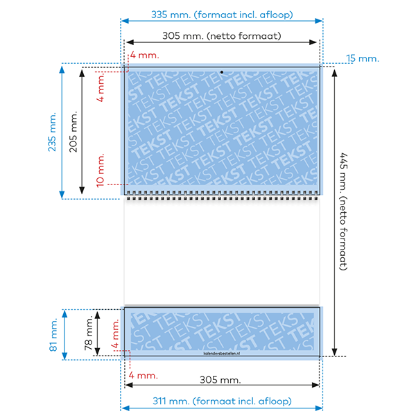 Zelf je maandkalender ontwerpen? Dat is bij ons heel makkelijk! Lever jouw logo, bedrijfsgegevens of zelfs een achtergrondfoto aan via onze aanleverspecificaties, en wij regelen de rest. Standaard bedrukken wij deze kalender met jouw eigen logo, foto(s) en bedrijfsgegevens. De kalender heeft een grote achtergrond (30,5 x 44,5 cm) voor jouw foto’s. Heb je geen eigen ontwerp? Geen zorgen, ons team helpt je graag met een professioneel design.